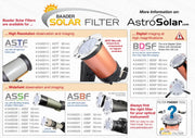 Baader Solar Filters are available in 3 types; ASTF - AstroSolar Telescope Filter, ASSF - AstroSolar Spotter Filter, and ASBF - AstroSolar Binocular Filter. With a total 21 sizes, there is a Baader Solar Filter available to fit practically every Telescope, Spotting Scope and Binocular.