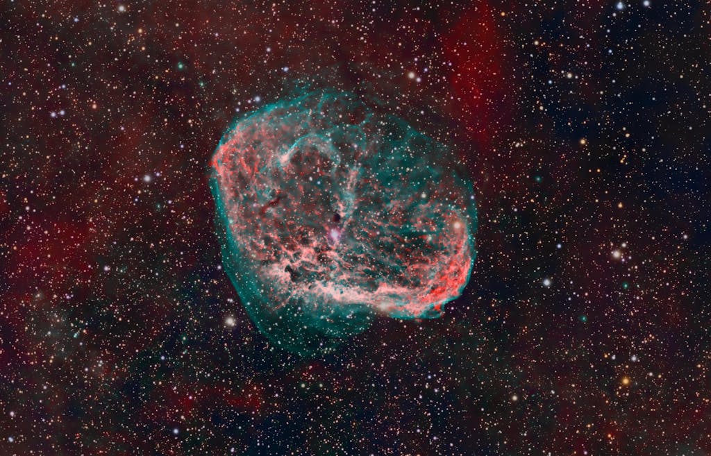 Supernova remnant W63 glows like a faint cosmic smoke ring along the plane of the Milky Way toward the northern constellation Cygnus. Its spectral appearance is reflected in the region’s rich complex of interstellar clouds and dust by an eerie blue glow, captured with Optolong’s new dual band 3nn filter!! L-Ultimate…